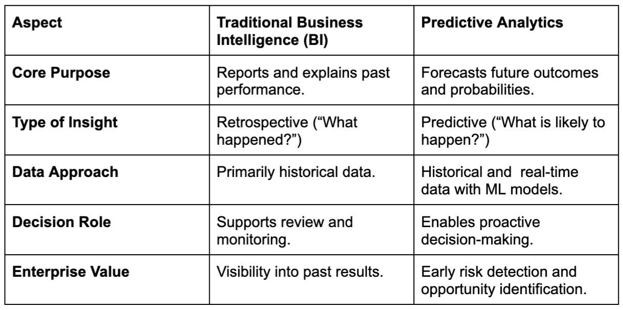 Today, success is measured by time-to-insight. Enterprises require systems that go beyond recording what happened yesterday and instead apply real-time machine learning (ML) to flag supply chain bottlenecks, predict customer churn, and mitigate financial risk before it impacts the balance sheet. This shift marks the transition from passive reporting tools to intelligent, forward-looking platforms—the foundation of the Predictive Enterprise.