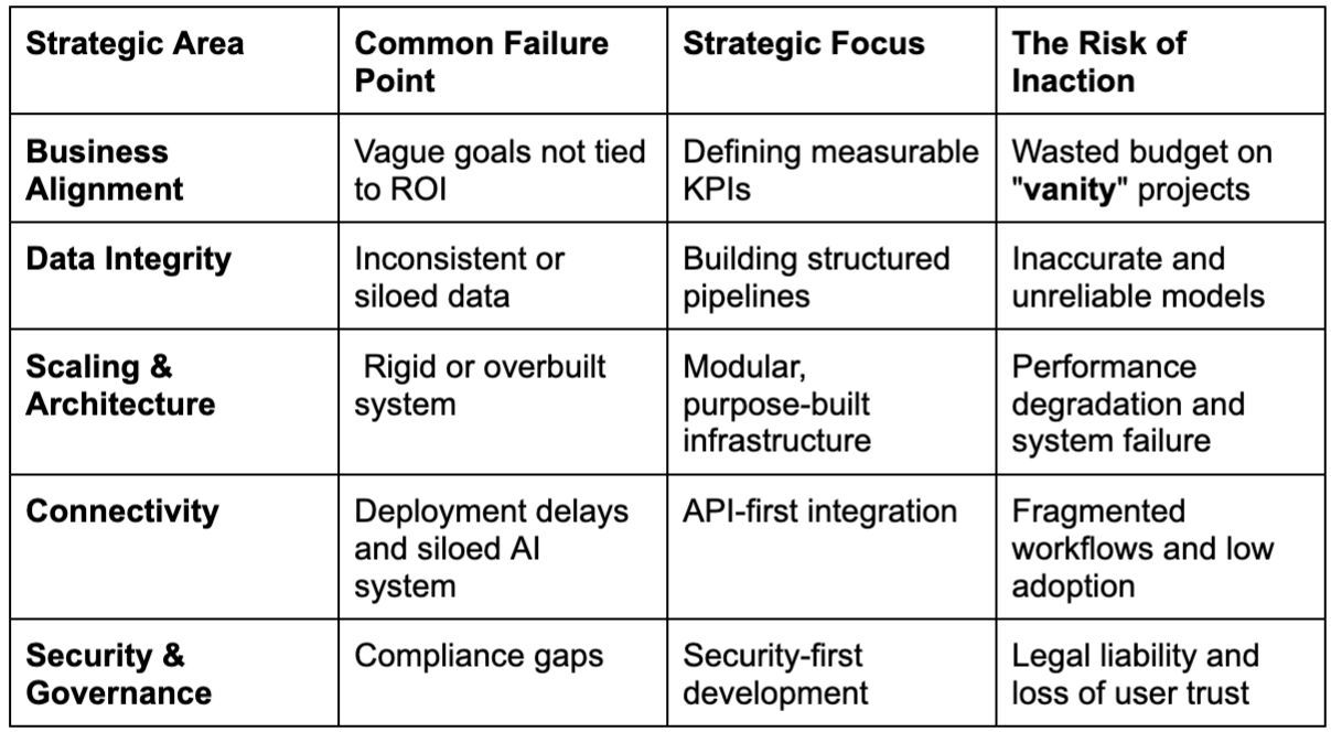 The table below highlights common AI project gaps and the strategic focus areas required to address them effectively.